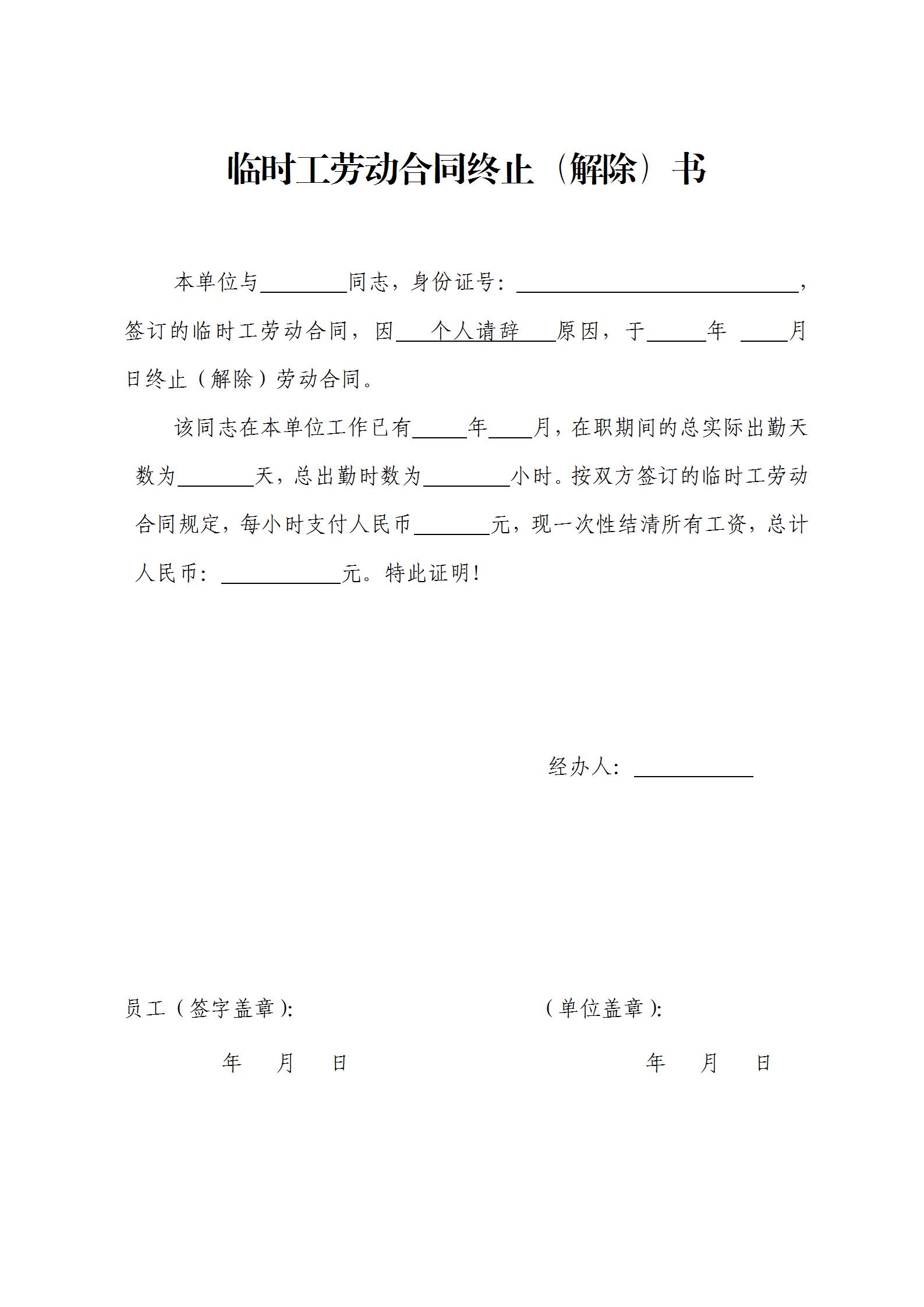 本单位与 同志,身份证号: ,签订的临时工劳动合同,因 个人请辞 原因,于 年 月 日终止(解除)劳动合同。